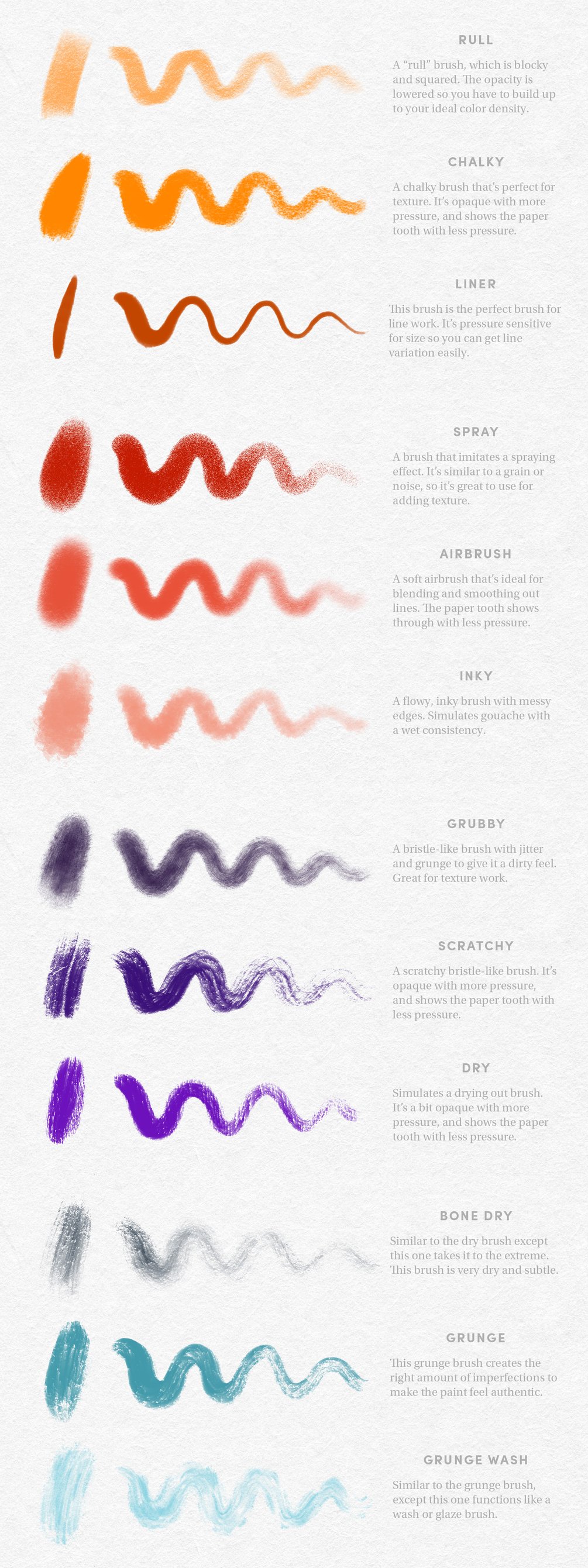A short description of each brush is in the product images to help you get a feel for how the tools can be used. This product is only compatible with Procreate 4+.