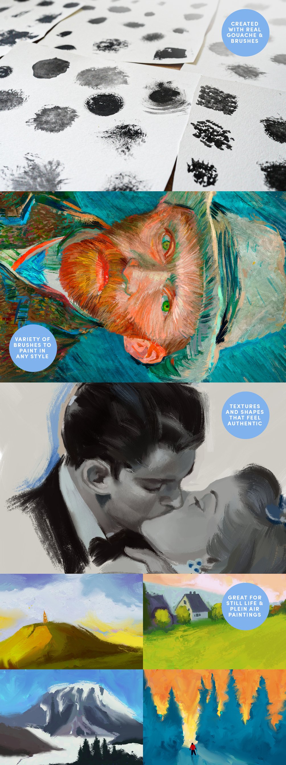 The Gouache Set features 37 custom brushes that were handmade using real gouache and paint brushes and then scanned in at a high resolution for an authentic look and feel. These brushes were designed to emulate gouache on watercolor paper. A seamless, hi-res watercolor paper was used for the texture to ensure perfect brush strokes every time. The Gouache Set includes a variety of brushes that represent gouache in its many forms, from a dense opaque brush to a watery wash and everything in between.