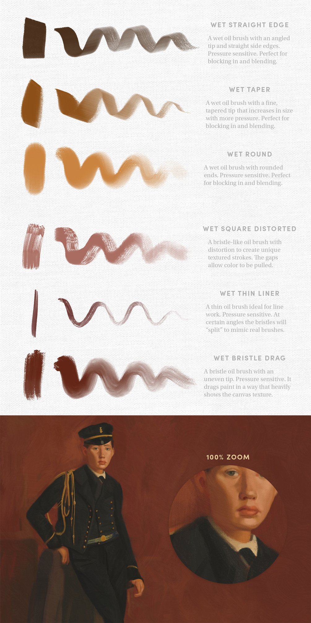 A short description of each brush is in the product images to help you get a feel for how the tools can be used. All master studies I painted in the preview images were created using only brushes in the pack.