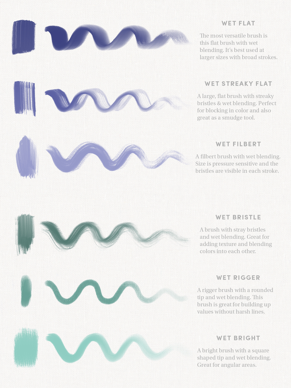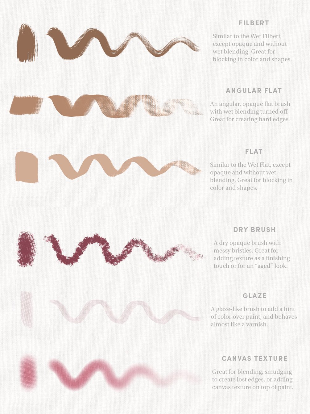 A short description of each brush is in the product images to help you get a feel for how the tools can be used. All master studies I painted in the preview images were created using only brushes in the pack.